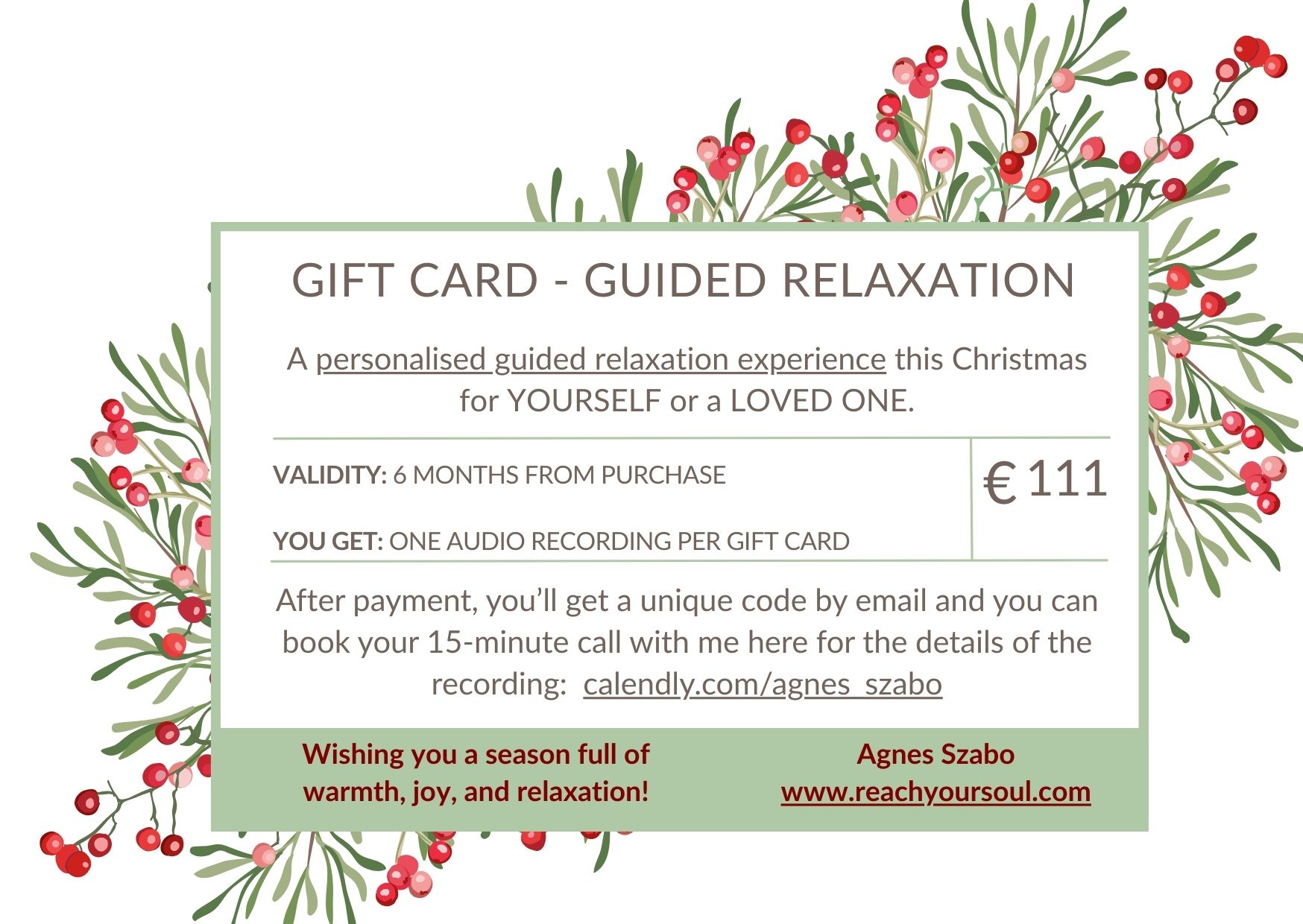 The recipient uses the code to book a 15-minute chat with me, so I can understand their needs and create a fully personalised guided relaxation.